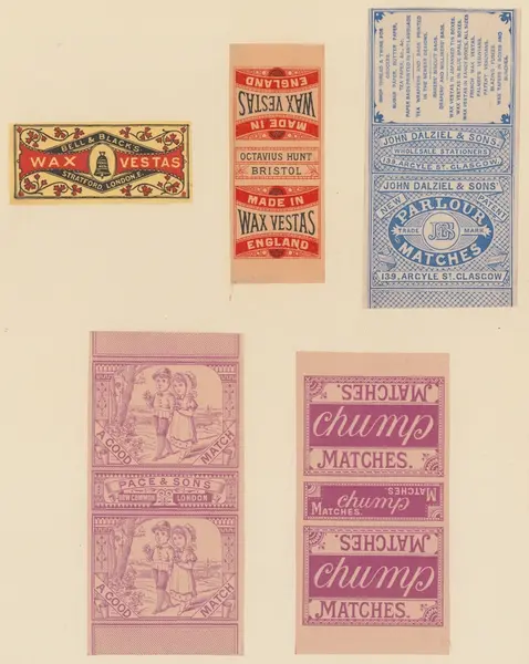 Etiketter för tändsticksaskar, från Svenskt Industri- och Handelsmuseum.