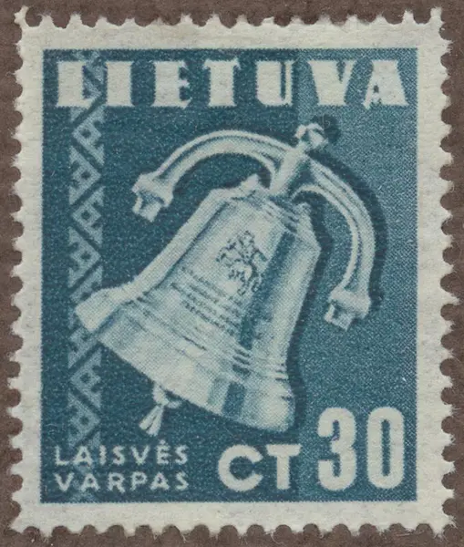 Frimärke med motiv av Litauens frihetsklocka, motiv på klockan av Vytis (Waykimas), ryttare med vapen som finns på statsvapenskölden. Klockan är gjord i USA mellan 1919-1922.