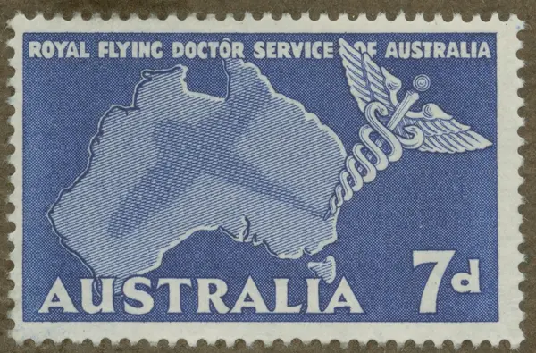 Frimärke från Australien, 1957. Motiv av karta över Australien. Skygga av flygplan. "Till ära för: Royal Flying Doctor Service of Australia".
