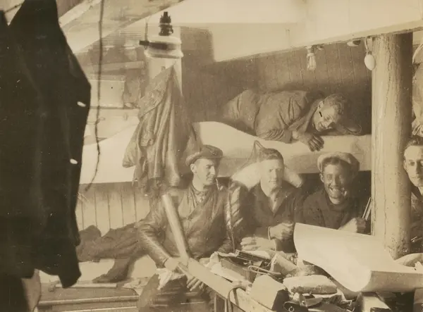 Fotografi från expedition till Sveagruvan. Motiv av fem män som umgås inomhus.