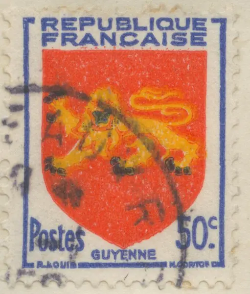 Frimärke med motiv av Guyenne's Vapen, en fransk provins och även den franska regionen Aquitaniens Coat of Arms. "Serie: franska provinsers vapen" från Frankrike 1949.