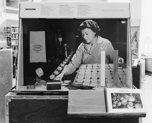 Dokumentation av den lilla utställningen av "Kulor, Krus och Kaviar". Sätts upp på Västerås stadsbibliotek. Vandringsutställning. Samarbete mellan Tekniska museet och Riksutställningar. Ljungslöfs ettan-monter
