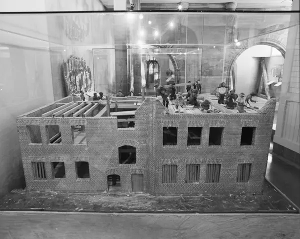 Dokumentation av "Sverige bygger" utställningen.I montern, en modell i skala 1:20, hur arbetet gick till med väggarna på Surbrunnsgatan 11.