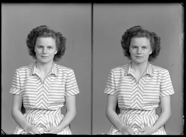 Kvinnoporträtt, pass. Margot Arvidsson, Barnängsgatan 18, Hallstahammar.Ur Gustaf Åhmans samling.
