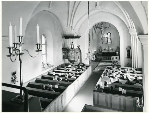 Badelunda sn, kyrkan.Interiör med pågående gudstjänst, 1983.