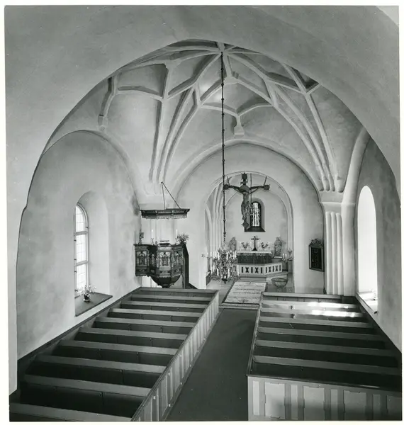 Badelunda sn, kyrkan.Interiör med predikstol m.m., 1983.
