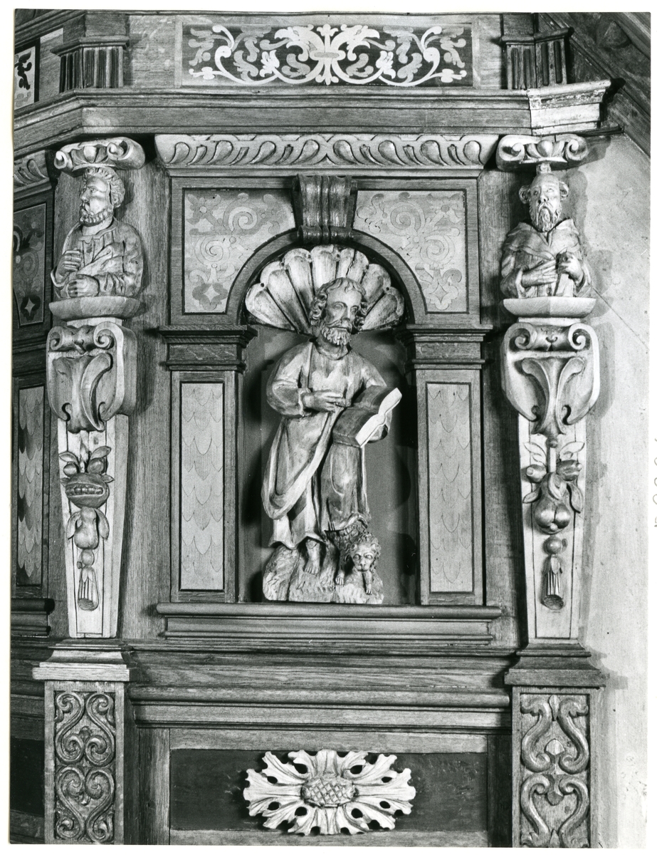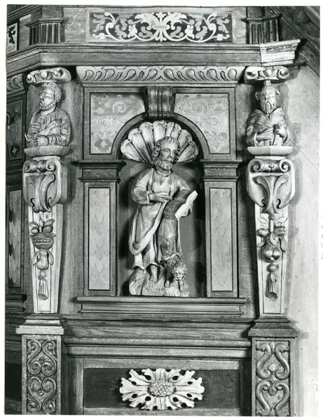 Badelunda sn, kyrkan. Detalj av predikstolen från 1655. 1983.