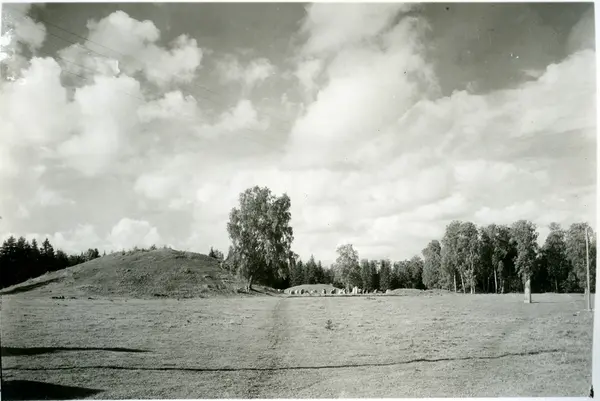 Badelunda sn, Anundshögsområdet, Långby."Anundshögsområdet taget ifrån ingången." Med Anundshögen, stora skeppssättningen och runstenen.
