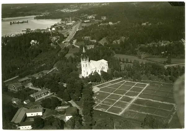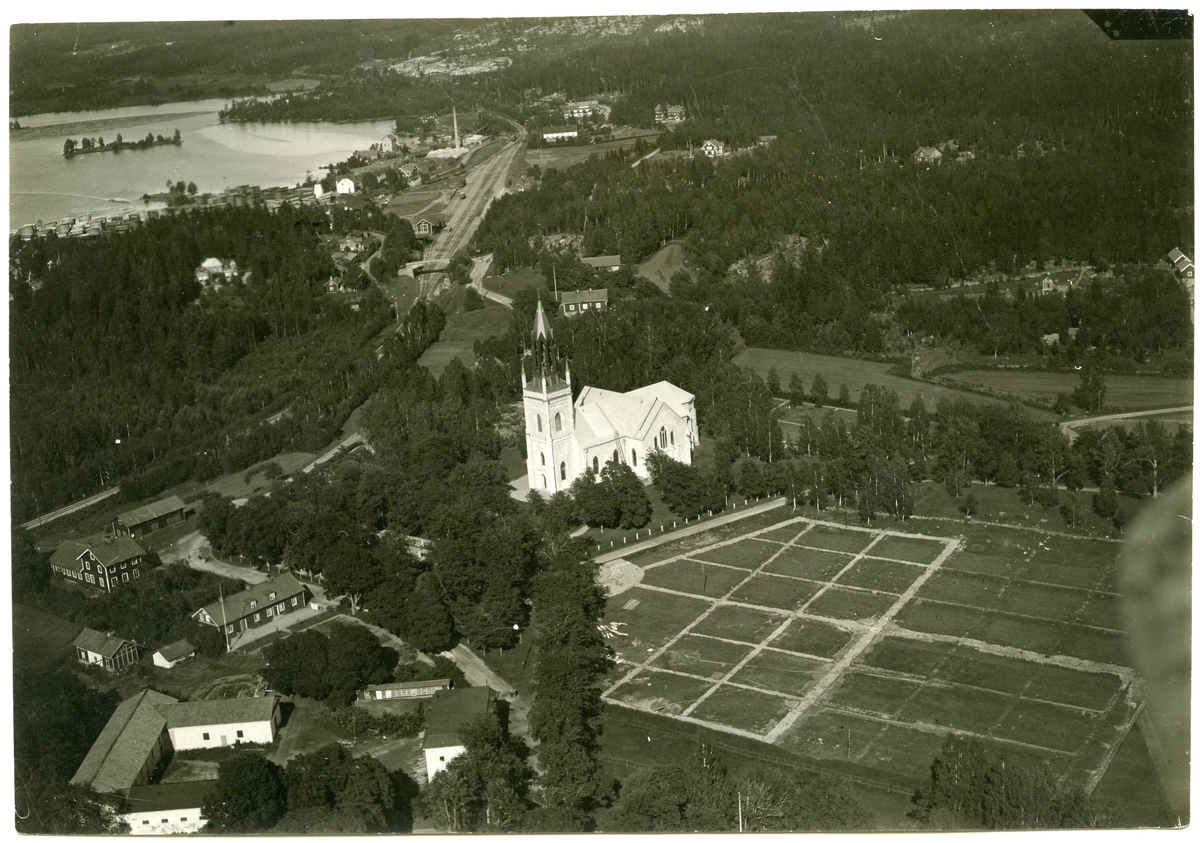 Skinnskatteberg sn, Skinnskattebergs kn.Flygfoto över Skinnskattebergs kyrka, 1922.