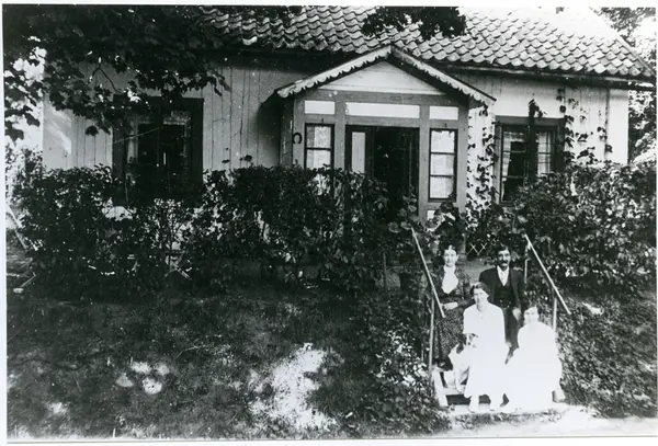 Skinnskatteberg sn, Skinnskattebergs kn, Skinnskattebergs herrgård.Trädgårdsmästare Carl Andersson med familj på trappan till bostaden, 1912.