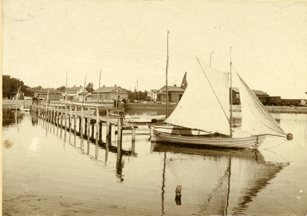 Hamnen i Västerås, med segelbåt i förgrunden och Tullhuset i bakgrunden.