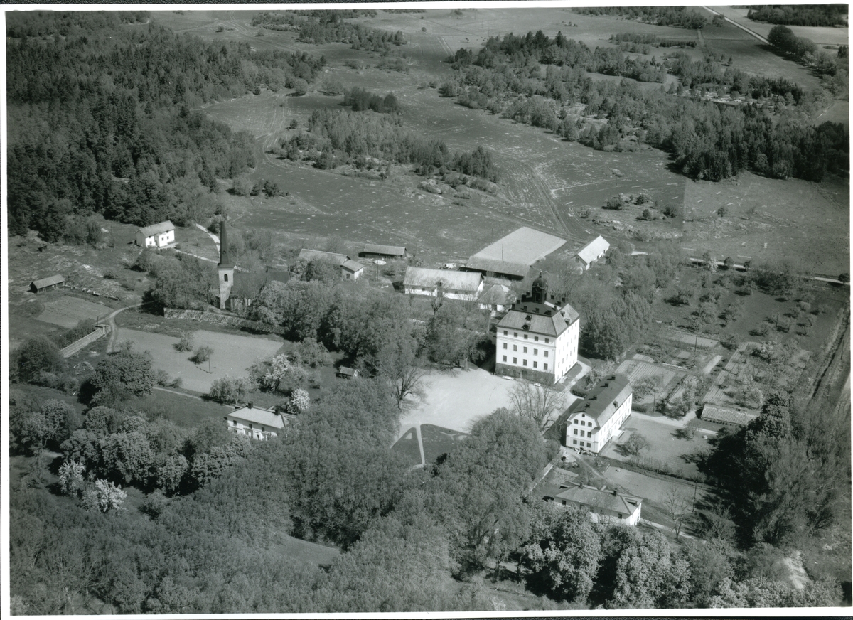 • Flygfoto över Ängsö slott och Ängsö kyrka