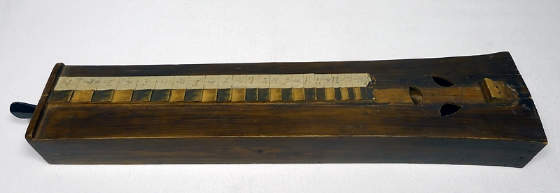 • Text i acc. katalog: Psalmodikon, något vidgad i överändan, skrivna siffror, 3 ljudbån i en krets, har botten med ett fyrkantigt hål.