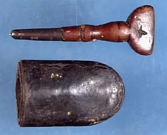GLASMÄSTAR Enligt liggaren "Glasskärare som 1847 köptes av föreg." (inv. nr. 35357 hemmansäg. Anders Johansson i Lilla Tomten, Skår, Levene) "och då uppges vara 50 år gammal." Diamanten ligger i ett tillhörande fodral som har måtten L 77, B 48, TJ 21 mm. Neg.nr: 1983-0003 Sakord: DIAMANT med fodral Tillverkningstid: 1790-1800 Material: JÄRN TRÄ LÄDER? Teknik: SVARVAT SKURET SYTT Mått: L=105 B=37 TJ=14 Vikt: