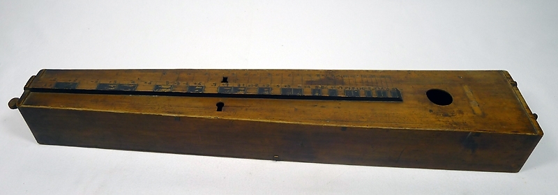 • Text i acc. katalog: Psalmodikon, bredare vid framänden, har botten, notsiffrorna inbrända, stall borta, skruvar för många samljudande strängar.