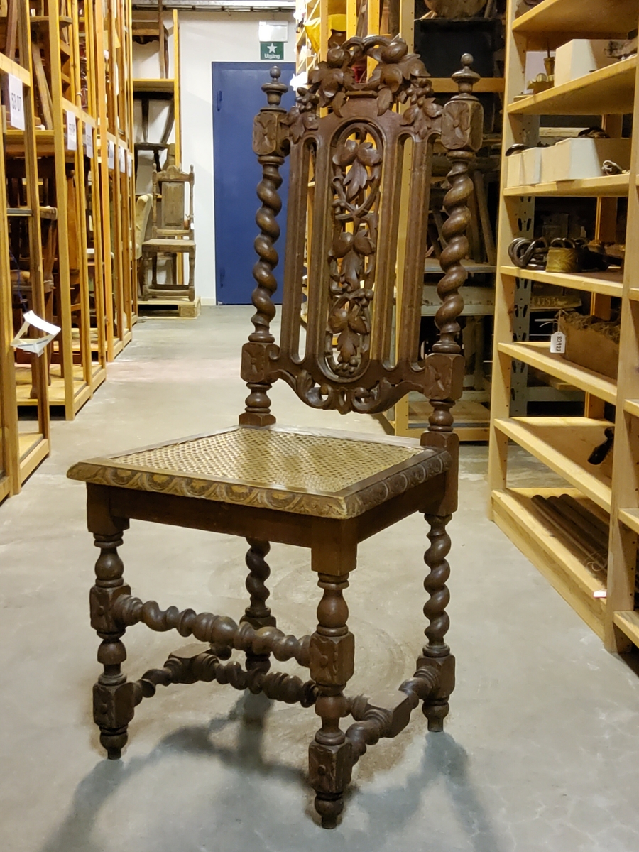 • Stol av ek i nyrenässans, flätad sits i rotting. Skuren rygg och sits, spiralformade ryggstolpar och bakben, svarvade framben och benkryss. Identisk med inv nr 69817