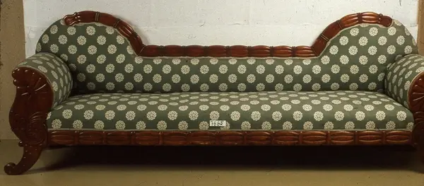 Mycket bred soffa med skuren sarg och rygg i rottingstil, svängda armstöd i valthorns form, svängda ben. Stoppad rygg och sits, klädd med grönt tyg med vita blommönster. Finns även 4 karmstolar och 10 stolar i samma stil. Stomme i furu och skurna delar troligen av alm.