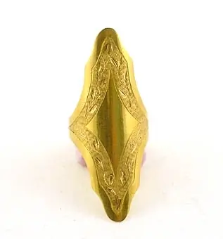 Enligt liggaren: Etui av skinn med inneliggande fingerborg och tvänne syringar, med stora plattor, ciselerade, av guld.