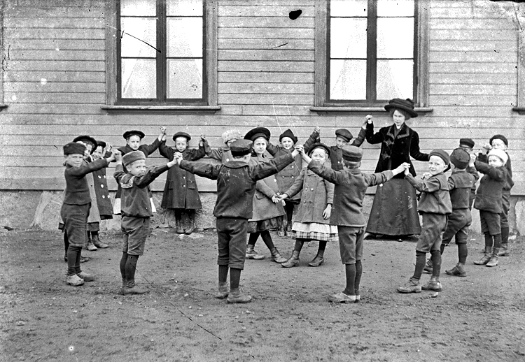 • EN SKOLKLASS MED LÄRARE I FÄRD ATT LEKA EN LEK.