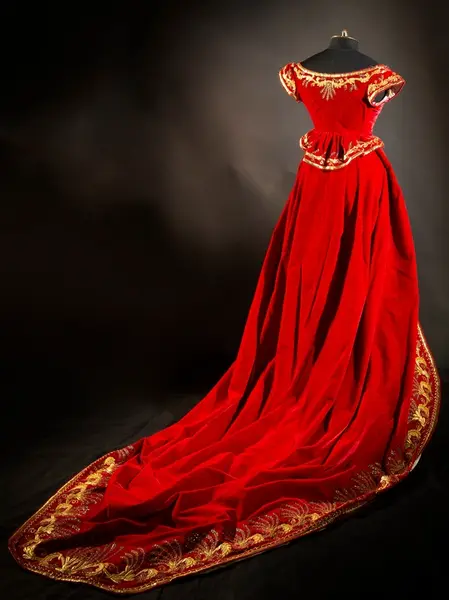 Mantel av röd sammet, rikt guldbroderad. Nr 2 i förteckningen. Liv till hovdräkten av rött sammet med rikligt broderi i guld märkt med . B. Dräktdel - (Oläsligt ord---?) skärm (?) av röd sammet med vi...