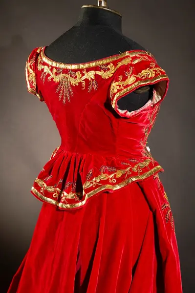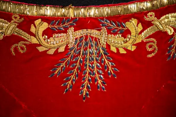 Mantel av röd sammet, rikt guldbroderad. Nr 2 i förteckningen. Liv till hovdräkten av rött sammet med rikligt broderi i guld märkt med . B. Dräktdel - (Oläsligt ord---?) skärm (?) av röd sammet med vita sidenband i ändarna (liksom månskära C. Bred sleif med rikligt broderi i guld röd sammet. D. Livstycket med vita sidenband. E. Något maläten vid (oläsligt ord---?) före inl. till V. museum.