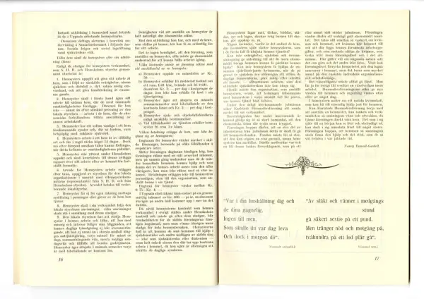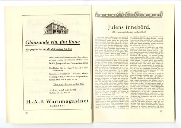 Trycksak häftat med tre häftklamrar, utgörande av 50 sidor och mjuk pärm. Häftet är tryckt i svart/vitt och omslaget i två färger; svart och grönt, föreställande en julgran med ljus och stjärna. Innehållet är blandat med reklam och författade texter om husmodersföreningens verksamhet och engagemang.