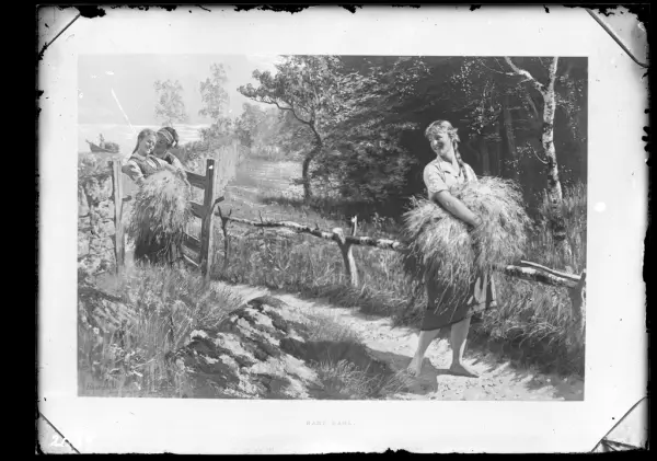 • På kuvertet står följande information sammanställd vid museets första genomgång av materialet: Flickor som bär hö.