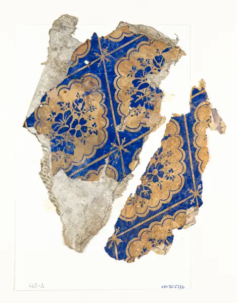 Fragment av en rombmönstrad tapet med tryckt ultramarinblå fond. Mitt i varje ruta finns en ultramarinblå blombukett i en långsträckt medaljong med uddig kant. Mötet mellan romberna markeras med ett kors i gotisk stil.'
