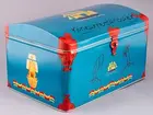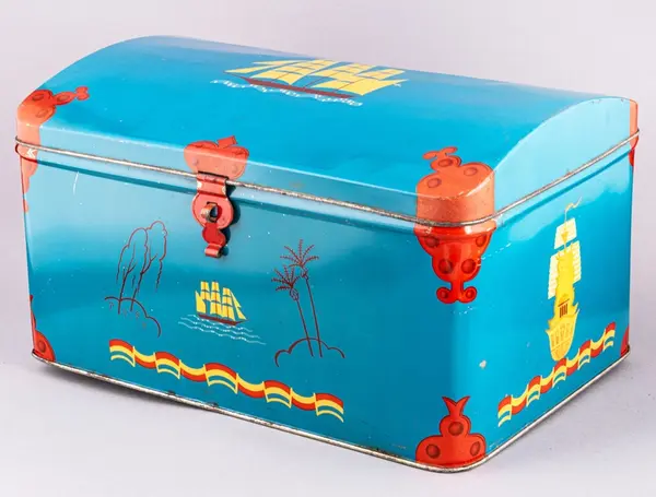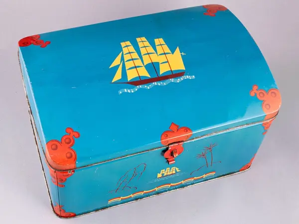 • Plåtburk, rektangulär med välvt lock. Blå med röda och gula detaljer. Bild av segelfartyg på locket. Låskläpp med ögla, röd.