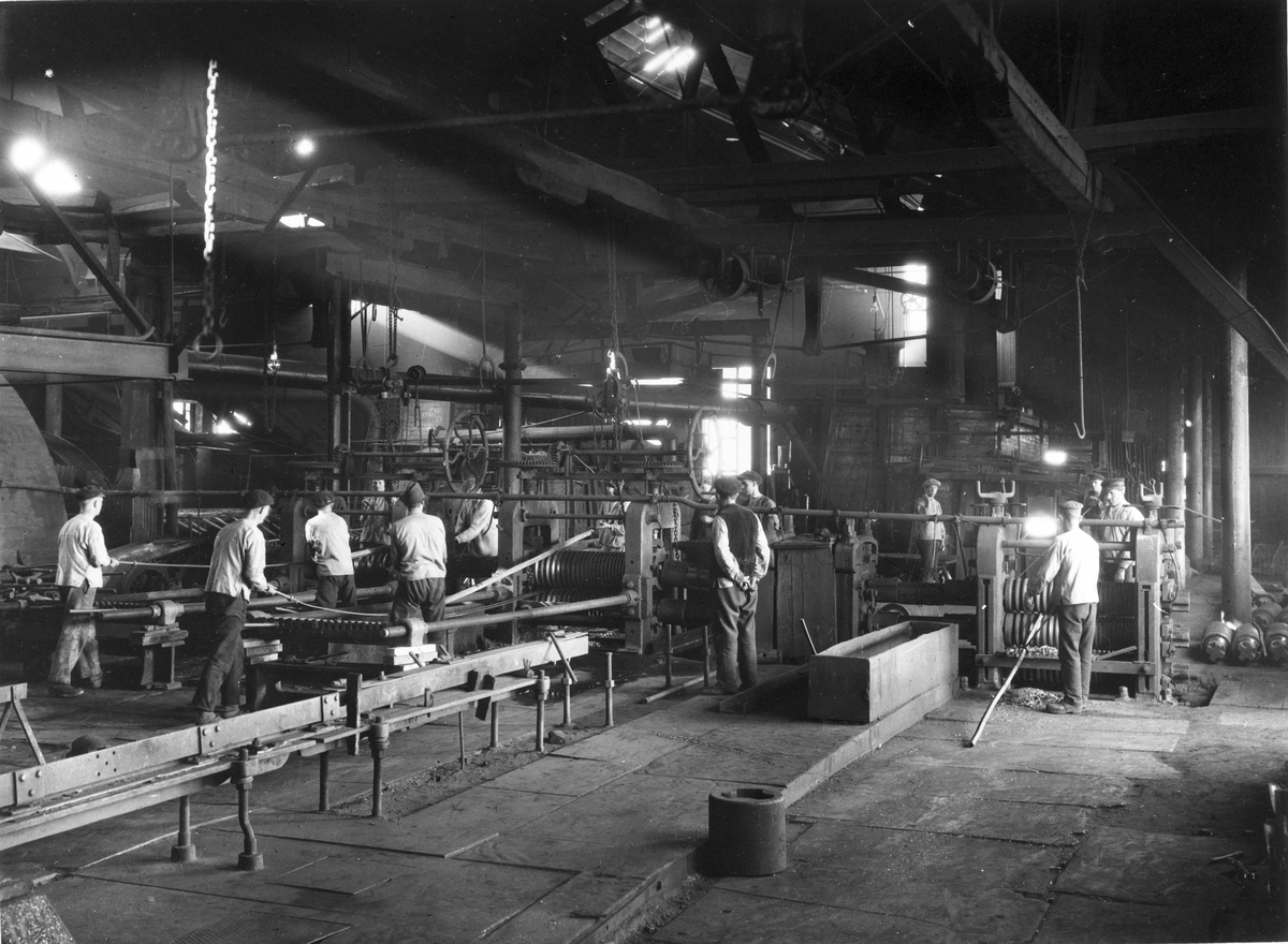 Forsbacka jernverk. Rörvalsverket, rörvalsning i finparen. Foto: Carl Larsson, 1920-talets början.