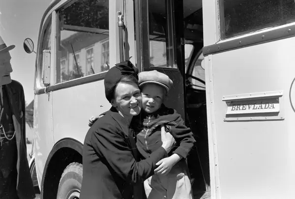 På väg till Frälsningsarmens barnkoloni i Rörberg. Taget den 10 maj 1950 i Stenebergsparken