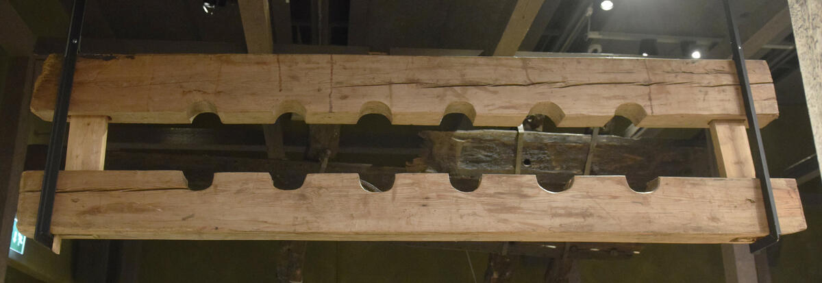 • Straffstock. två stockar med rektangulärt tvärsnitt ligga intill varandra. I de mot varandra liggande sidorna urtagningar för 6 st hål med omkr. 10 cm. diam. I den övre stocken löper på två tappar, fästade i vardera ändan av den undre stocken. Ett järnbeslag med äspa avsett för stockarnas fastlåsande intill varandra.