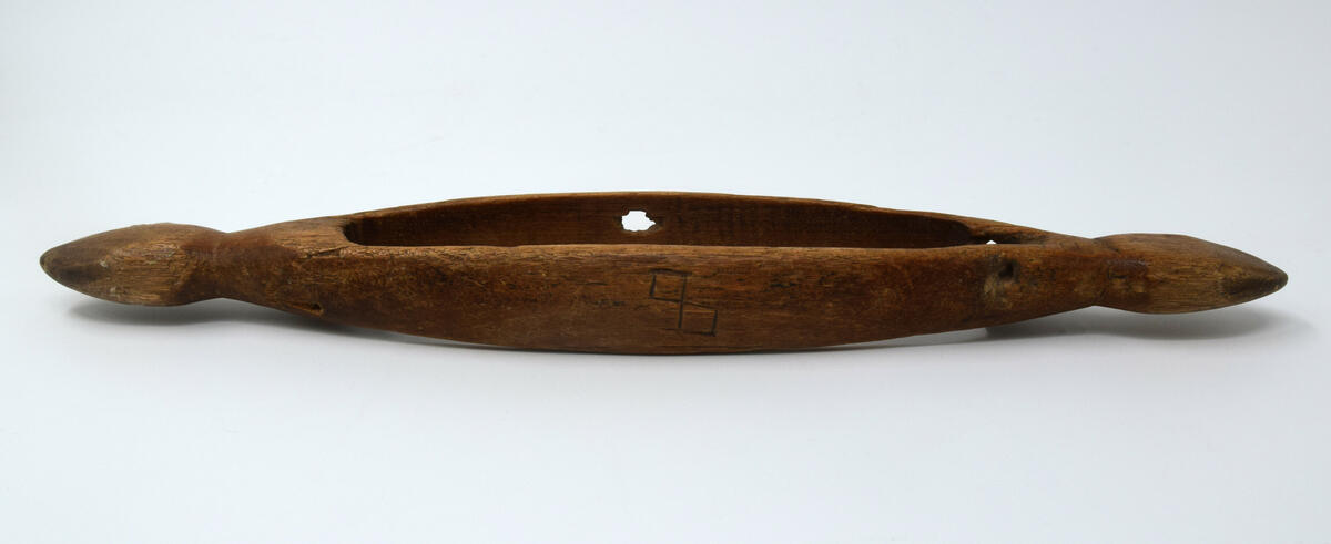 Vävskyttel, av björk. Spolformig. Med ovala ändpartier. Spolhållare saknas. Hål i ena änden på långsidorna för att kila fast spolhållaren, i andra änden hål in i den ovala delen för att hålla fast spolhållare. Hål i långsida för att tråden att löpa genom.