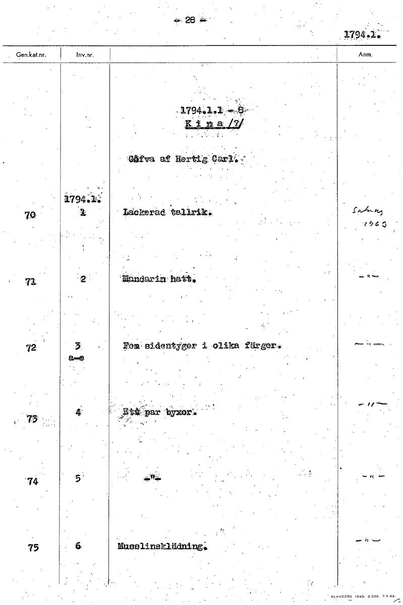 • 17 a Gäfva af Hertk ear », • 70 Lackerad tallrik., Mandariniatta 72 geDarsidentyger i olika färger .■ par bixor". 74 75 Muselinsklädning• [ocr]
