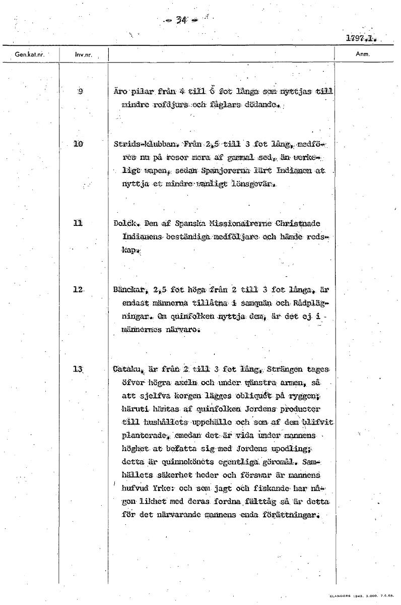 1797.1. - .9 Äro pilar från 4 till -6" fot långa som nyttjas till mindre rofdjurs och fåglars dödande. -10 strids,Atiubban, .F14å.ty, 45, -till 3 fot ung,,,,raedfö.t, res nu på resor mera af gatilmal tverke-4.: ligt waponi,- sedan SpaAjererna lärt Indianen , nyttja et rain' Ira'aal-igt löns gpväno 11 Dolek. Den af Spanska Missionairerne Christnade Indianens- beständiga, riedföijare, och hände reds 12 Bänckar, 295 fot höga från 2 till 3 fot långa, är endast männerna tillåtna i smaquän och Rådpläg- ningar. Om qttinfolken nyttja demi är det ej i - rgännernes närvaro. 13, är från- 2, till 3 fot långi, Strängen tages, öfver högra ax'eln och under viränE....tra amen, så , att sjelfva korgen lägges obliqtiä på ryggont, häruti Mätas quinfolken Jordens producter hush&11.ets uppehälle och 'som af deMIlifvit planterade-i, emedan det: ä.r vida, iluder mannens , höghet at befatta sig raed Jordens upodling detta är qninnokönets egentliga, göromål-. Sam.,. hällets säkerhet heder och försvar mannenå hufvnd Yrkev och som jagt oth fiskande, har nåt gem med deras fordna , fälttåg så 'är detta för det närvarande Jgannens enda förättningar: [ocr]