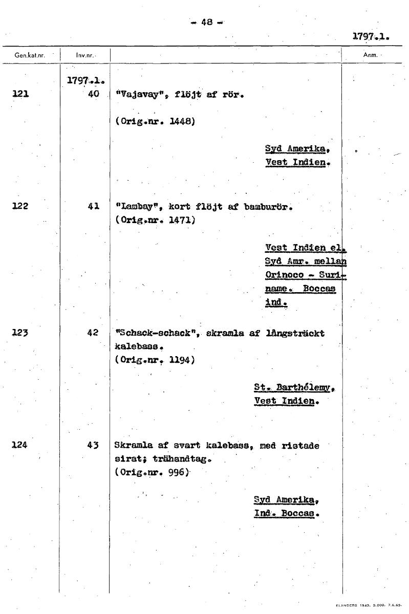 17974. 1797,914 121 40 nVajavgy", flöjt af rör. (Orig.nr. 1448) W.Amulka, Vest Indien» 122 41 °Umbar, kort flöjt af bamburör. (Orig.nr. 1471) Vest Indien el S d Amr me Orinoco Suri name. Boccas ind, 1...