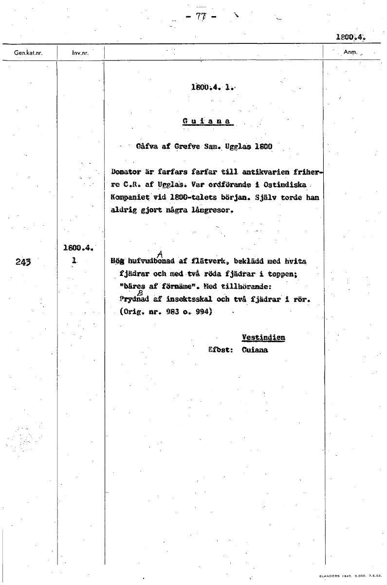 - 71 - 180M. 1800:4. 1.. Oulana - Oåfva af Orefve Ugglaä l800 Donator är farfars farfar till antikvarien frihe -re C.R..af Ugglas: Var ordförande i Ostindiska: Kompaniet vid 1800-talets början. Själv torde han aldrig gjort några långresor. 1800.4. 243 hufvudbonad af flätverk, beklädd med hvita fjädrar och med två röda fjådrar i toppen; "bäres af förnäme". Med tillhorande: Prydnad af insektsskal och två fjådrar i rör. (Orig. nr. 983 o. 994) Vestindien Efbst: %lana [ocr]Stäng