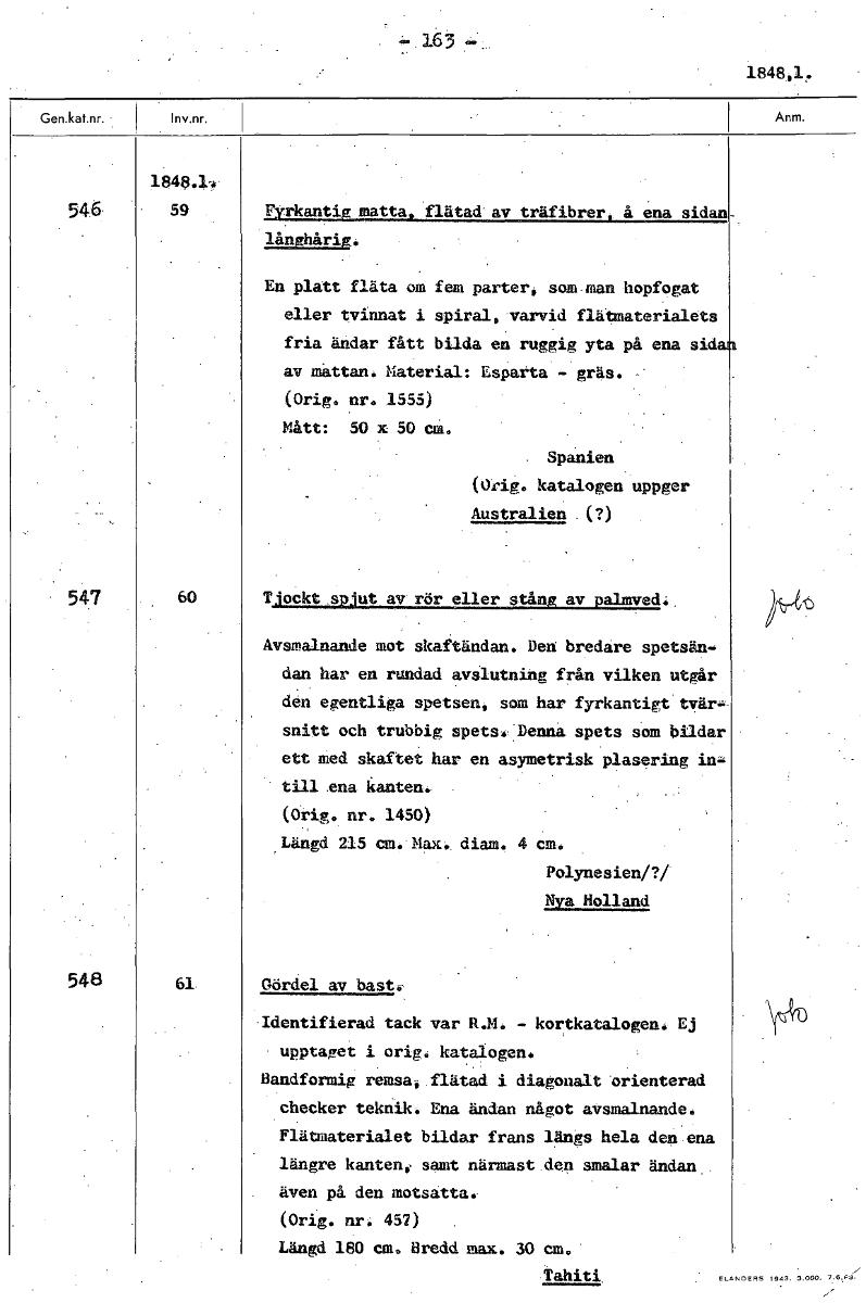163 1848,1. 18413.1- 546 59 Fyrkantig matta, flätad av träfibrer, å ena sidan långhårig. En platt fläta om fem parter, som man hopfogat eller tvinnat i spiral, varvid flätmaterialets fria ändar fått bilda en ruggig yta på ena sid av mattan. Material: Esparta - gräs. (Orig. nr. 1555) Mått: 50 x 50 cm. Spanien (Orig. katalogen uppger Australien (?) 547 60 Tj2sÅL.gRjiLtgyzugpån av alinved: Avsmalnande mot skaftändan. Den bredare spetsen- dan har en rundad avslutning från vilken utgår den egentliga spetsen, som har fyrkantigt tvär- snitt och trubbig spets. Denna spets som bildar ett med skaftet har en asymetrisk plasering in- till ena kanten. (Orig. nr. 1450) Längd 215 cm. Max. diam. 4 cm. Polynesien/?/ Nya Holland 548 61 Gördel av bast. Identifierad tack var R.M. - kortkatalogen. upptaget i orig. katalogen. Bandformig remsa, flätad i diagonalt orienterad checker teknik. Ena ändan något avsmalnande. Flätmaterialet bildar frans längs hela den ena längre kanten, samt närmast den smalar ändan även på den motsatta. (Orig. nr. 457) Längd 180 cm. Bredd max. 30 cm. Tahiti [ocr]