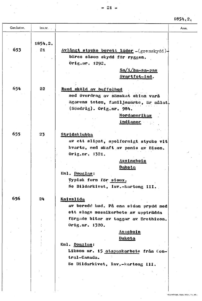 - 21 13.2. 1854.2. 653 21 allaa21315.L.12222djg2MU:-(grenskydd)- bäres säsom skydd för ryggen. Orig.nr. 1292. Sa/i/ha-sa-pas Svartfot-ind. 654 no Rund sköld av buffelhud . Med Överdrag av sämskat skinn, varå ägarens totem, familjemärke, är mälat (Söndrig). Ori ålro 984. Nordamerikas indianer 655 23 Stridsklubba av ett slipat, spolformigt. stycke vit kvarts, ned skaft av penis av Bison. Orig.nr. 1321. Assineboin Dakota Enl. Douglas: Typisk form for sioux. Se Bildarkivet, my-kartong III. 656 24 Knivslida av beredd hud. På ena sidan prydd med ett slags mosalkarbeteav uppträdda färgade bitar av taggar av Erethizon. Orig.nr. 1320. Anseboin Dakota Enl. Douglas: Liksom nr. 15 atapasharbete frän Con-' tral-Canada. Se Bildarkivet, kartong [ocr]Stäng