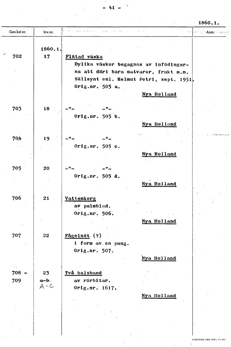 - 41 - 1860.1. 1860.1. 702 17 Flätad väska Dylika väskor begagnas av infödingar- na att däri bära matvaror, frukt m.m. Sällsynt enl. Helmut Petri, sept. 1951 Orig.nr. 505 a. Nya Holland 703 18 Orig.nr. 505 b. Nya Holland 704 19 Orig.nr. 505 e. Nya Holland 705 20 Orig.nr. 505 d. Nya Holland 706 21 Vattenkorg av palmblad. Orig.nr. 506. Nya Holland 707 22 Fågelnät (?) i form av en pung. Orig.nr. 507. Nya Holland 708 - 23 Två halsband 709 11-43- av rörbitar. • A-c- Orig.nr. 1617. Nya Holland [ocr]Stäng