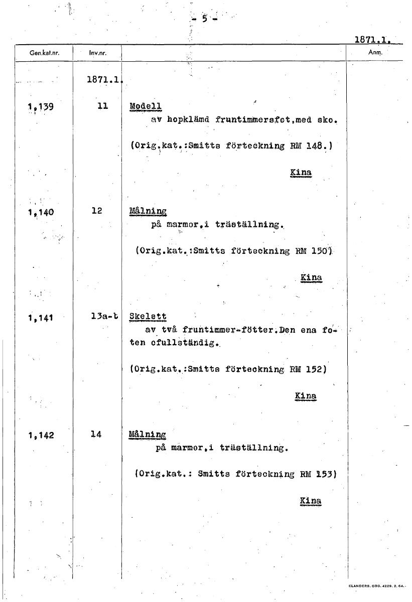 5 1871.1. 1871.1 1 139 '11 Modell av hopklämd fruntimmersfot,med sko. (Orig.kat.:Smitts förteckning RM 148.) Kina 1,140 12 Målning på marmor,i träställning., (Orig.kat.,:Smitts förteckning RM 150) Kin...