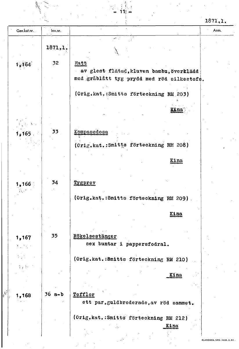 1871.1. 1871.1. 32 Hatt av glest flätad,kluven bambu överklädd med grållått tyg prydd med röd silkeetof (Orig.kat“Smitts förteckning RM 203) Kina 1,165 33 Kal2.92.2292 (Orig.kat.:Smitts förteckning PM 208) Kina 1 166 34 1U21£2 (Orig.kat“Smitts förteckning RM 209). Kina 1,167 35 111911ä2.9119= sex buntar i pappersfodral. (Orig.kat.:Omitts förteckning RM 210) Kina 1,168 36 a-,b Tofflor ett pareguldbroderade av röd sammet. (Orig.kat.:Smitts förteckning RM 212) Kina [ocr]Stäng