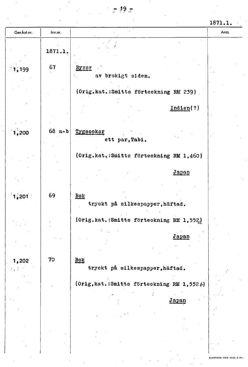 • - 19 - 1871.1. • 1871.11, ' *1'',1 9 9 67 W521 av brokigt siden. (Origåkat.:Smitte förteckning RM 239) Indien(?) 68 a,.1:4 Twalocksur. ett par,Tabi. (Orig.kat.:Smitts förteckning RM 1 460)' Japan '1,2... Visa hela