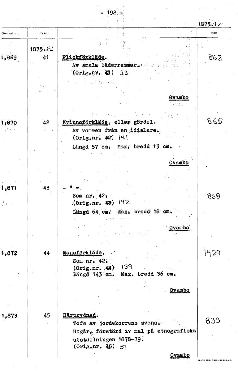 .4» 492 1875.1.- 1875 8'69 Pliekförkläde.. G2 Av smala läderremMar;» (Orig.nr,. 4a) 33 Ovambo 1;870. 42 Kvinnoförkläde, eller gördel. 9AS 'Åv vommen ftån en idislare. (Orig.nr'. fär) Oi I Längd 57 om....
