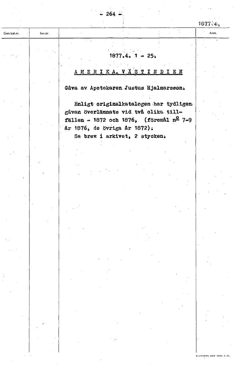 • - 264 — 1877-4,- 1877.'4: 1 - 25: AMERIKA V 25:STINDIEN Gåva av Apotekaren_ Justus Hjalmarsson: Enligt originalkatalogen har tydligen gåvan överlämnats vid två olika till- fällen - 1872 cch 18769 (för... Visa hela