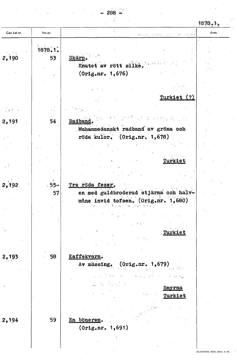 288 - 1878.1, 1878.1. 2,;196 53 Skärib. Knutet av rött silke. (Orig.nr. 1,676) Turkiet (?) 2,191 54 Radband. Mnhammedanekt radband' av gröna och röda kuiör. (Orig.nr, 1,678) Turkiet 2,192 Tre röda fezer, 57 en med guldbroderad stjärn och håle måne invid tofsen. Orig.nr. 1,680) Turkiet 2 193 Kaffekvarn. Av mässing. (Orig.nr. 1,679) Smvrna Turkiet 2,194 59 En bönrem, . (Orig.nr. 1.691) [ocr]