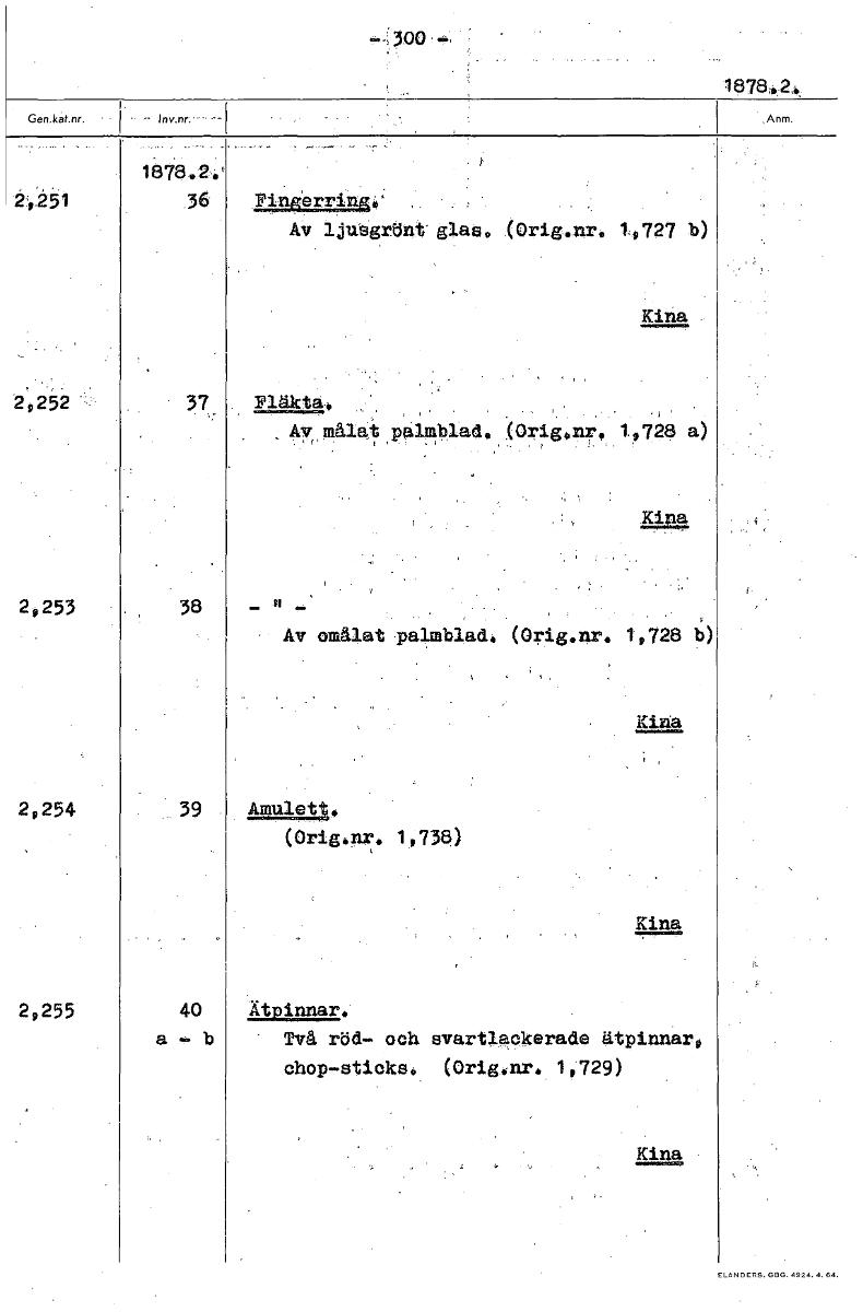 - 300 1878, 1878.2.' 2,251 36 Ilukuulaw› Av ljusgrönt' glas. Orig.nr. 1.,727 b) Kina 2,252 37 Fläkta, Av målet palmb ad, Orig.nr 19728 a) Ria 2,253 38 Av omålat paimbiad. (Orig.nr. 1,728 b) Kina 2,254...
