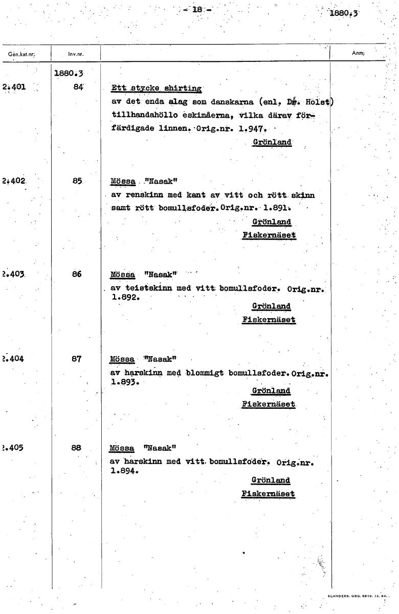 1880.3. 1880.3 2:401 • 84- Ett .stycke shirting av det. enda slag som danskarna (enl. D. Högst tillhandahöllo eskimåerna. vilka därav fiir!.. färdigade -Orig.nr. 1.947. - Grön/and 2:402 85 Mössa .."Na...Visa hela