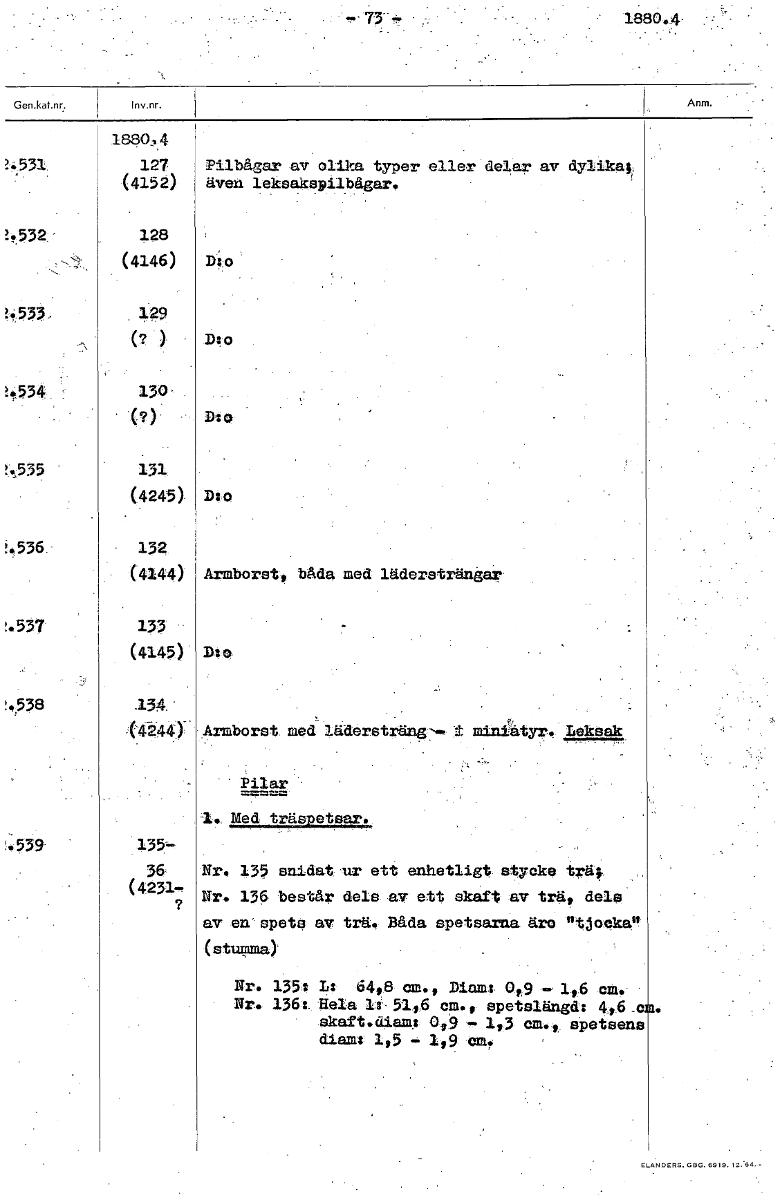 1880.4 18804 ?.531 127 Pilbågar av olika typer eller delar av dylika; (4152) även leksakspilbågar. 128 (4146) !.533: D:o ?t534 130• Duo !t535 131 (4245) D: o t.536 132 (4144) Armborst, båda med läders...
