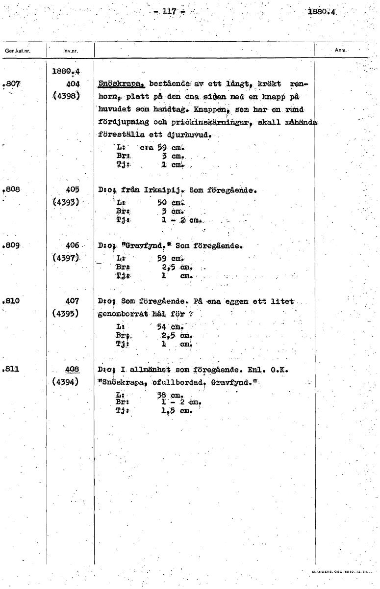164.30:4 18804 .807 404 Snöskrapa, bestående ett ,långt, krökt ren- (4398) horn,. platt pet:den ena. sitjan med e:i knapP på huvudet söm liaridtag. Knappen,, som her en rUnd fördjupning och priekinskärniiagar, Skall måhän föreställa ett djurhuvud.- -1a- 59 cm: 3 cm. Wt; I cm; .808 405 Dro;, från Irkaipij.- Som. föregående. , (4393) 'Ml 50 tia';,. 3 Oza.. 1 — 2, cra.. .809 406 nGravfynd.° Som föregående. (4397) ' 59 Brr 2,i5 em. 1 om., .810 407 DIO;, Som föregående. På ena eggen ett litet (4395) genomborrat hia för ?' L: 54' cin.' Br; 2,5 1 cm; • .811 408 Mol I allmänhet som föregående. Enl. O.K. (4394) itSnöskrapa, ofullbordE3.d. Gravfynd."- 38 =. Br: 1 - 2 cra. Tj: 1, 5 cm. [ocr]